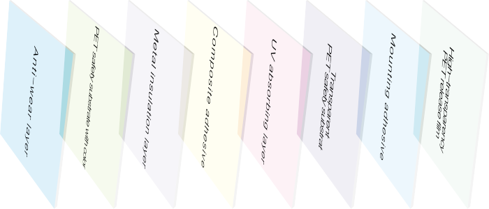 6. Transparent PET safety substrate: composed of high-strength and high-transparency PET film, the purpose of which is to sandwich the metal layer in the middle to prevent metal oxidation and prolong the life of the metal film.