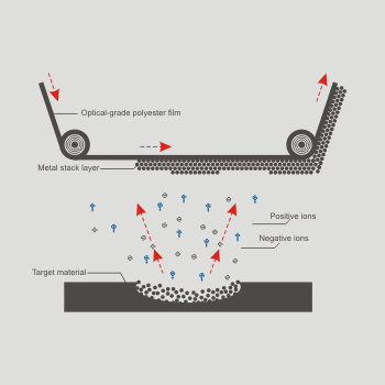 Vacuum Sputtering Process: The film is made with the heat evaporation (for pure metals at low melting temperature) process. It can be coated with various metals, alloys, or oxidation layers.The vacuum sputtering process is usually used for the pure aluminum coated film, and can make various films with different visible light transmittance and reflectivity so that the films can have the best sunlight control performance.