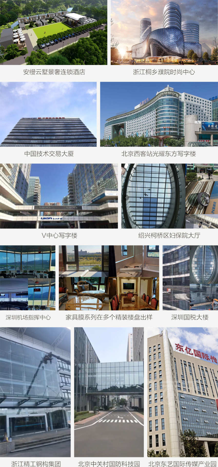 數十年如一日的殫精竭慮、苦心孤詣、高標準、嚴要求,使得雙星膜品敢于接受國際市場的考驗,并贏得了眾多國內外用戶的青睬。雙星國際酒店、安縵云墅酒店、浙江桐鄉濮院、浙江精工鋼構集團、紹興北海長遠養老院、紹興柯橋婦保院、深圳機場、深圳國稅大樓、北京中關村國防科技園、中國技術交易大廈、北京東藝國際傳媒產業園、北京西客站光耀東方寫字樓、北京南三環漢庭酒店等眾多知名建筑都選擇了雙星,將雙星建筑隔熱膜作為節能省電的“理財產品”。